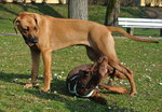 Er ist außerdem verträglich mit Hündinnen, bei Rüden entscheidet die Sympathie. Letztlich lässt er sich aber weder von Rüden noch von Hündinnen die Butter vom Brot nehmen und gibt im Spiel gerne den Ton an.