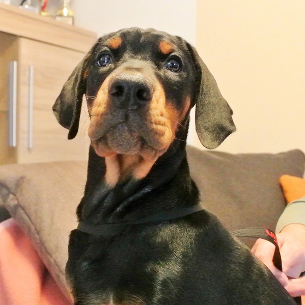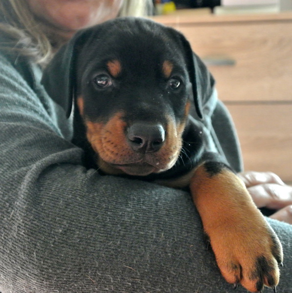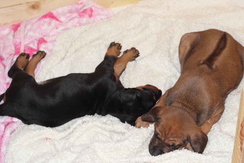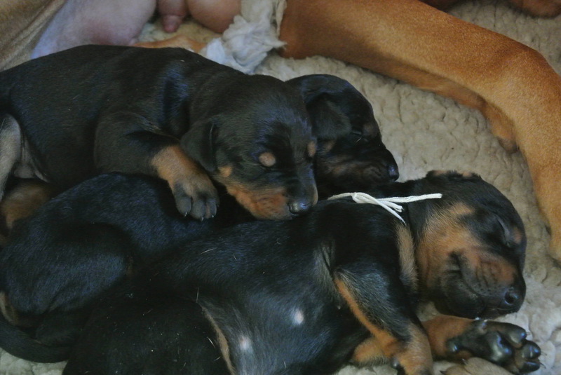 Bärbel hat nur ein Welpen-Mädchen geboren, die kleine Hermine (deutlich erkennbar in der schwarzen Meute :) und hat keine Sekunde gezögert, unsere U's anzunehmen.