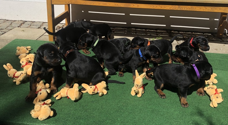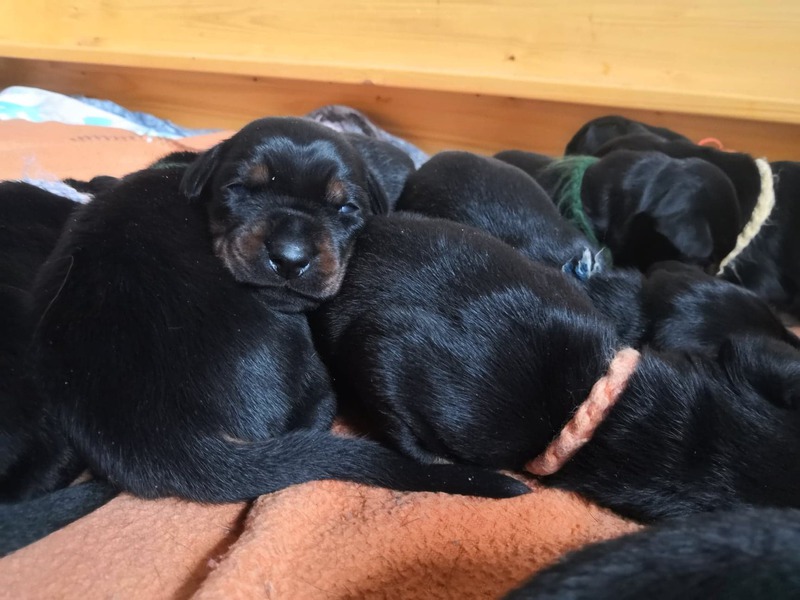 Es sind 12 Welpen, davon 3 Rüden und 9 Hündinnen, alle schwarz.
